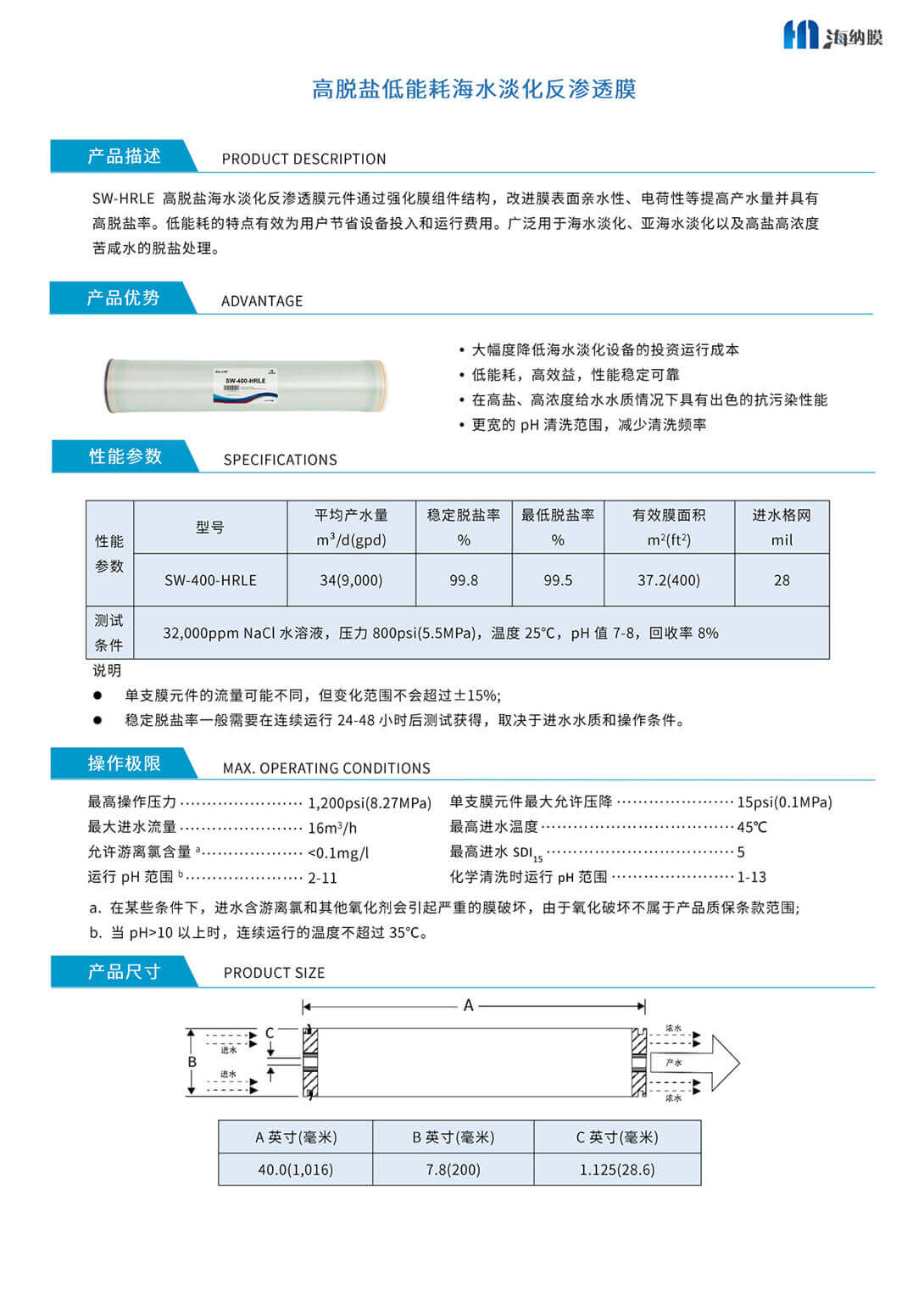 高脫鹽低能耗海水淡化反滲透膜 SW-400-HRLE產品優勢: